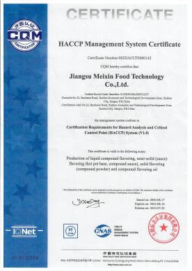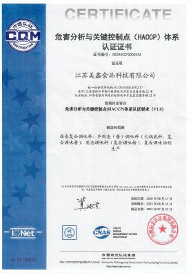 2020 年獲得了質量管理體系認證證書、危害分析與關鍵控制點(HACCP)管理體系證書,至今一直有效持有證書。